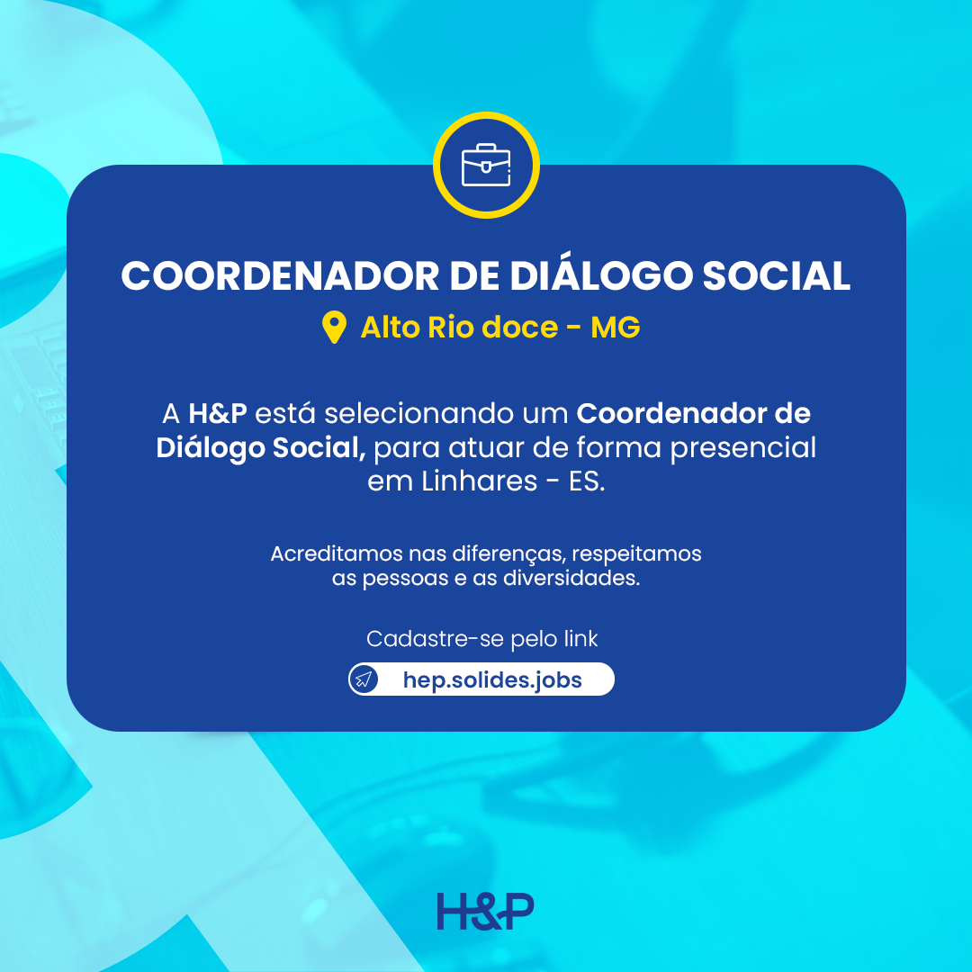A H&P está selecionando um Coordenador de Diálogo Social, para atuar de forma presencial em Linhares/ES.